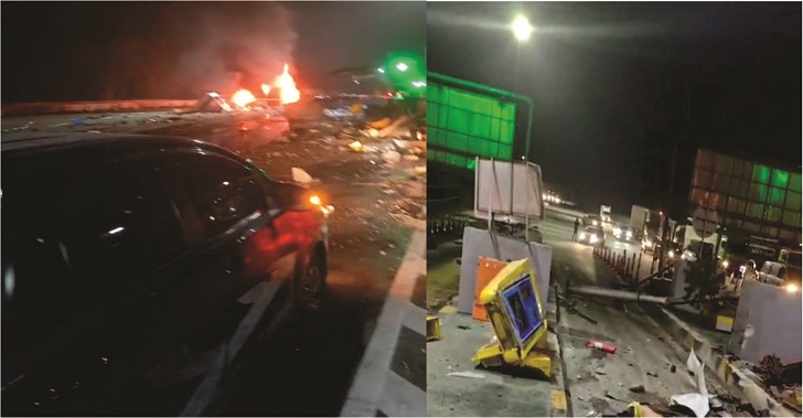 “Diduga kendaraan tersebut mengalami gagal fungsi rem (rem blong) sehingga menabrak rangkaian kendaraan yang sedang melakukan transaksi (pembayaran e-tol) tiga kendaraan hancur terbakar, tiga kendaraan lainnya mengalami kerusakan,” papar Kombes Eko.